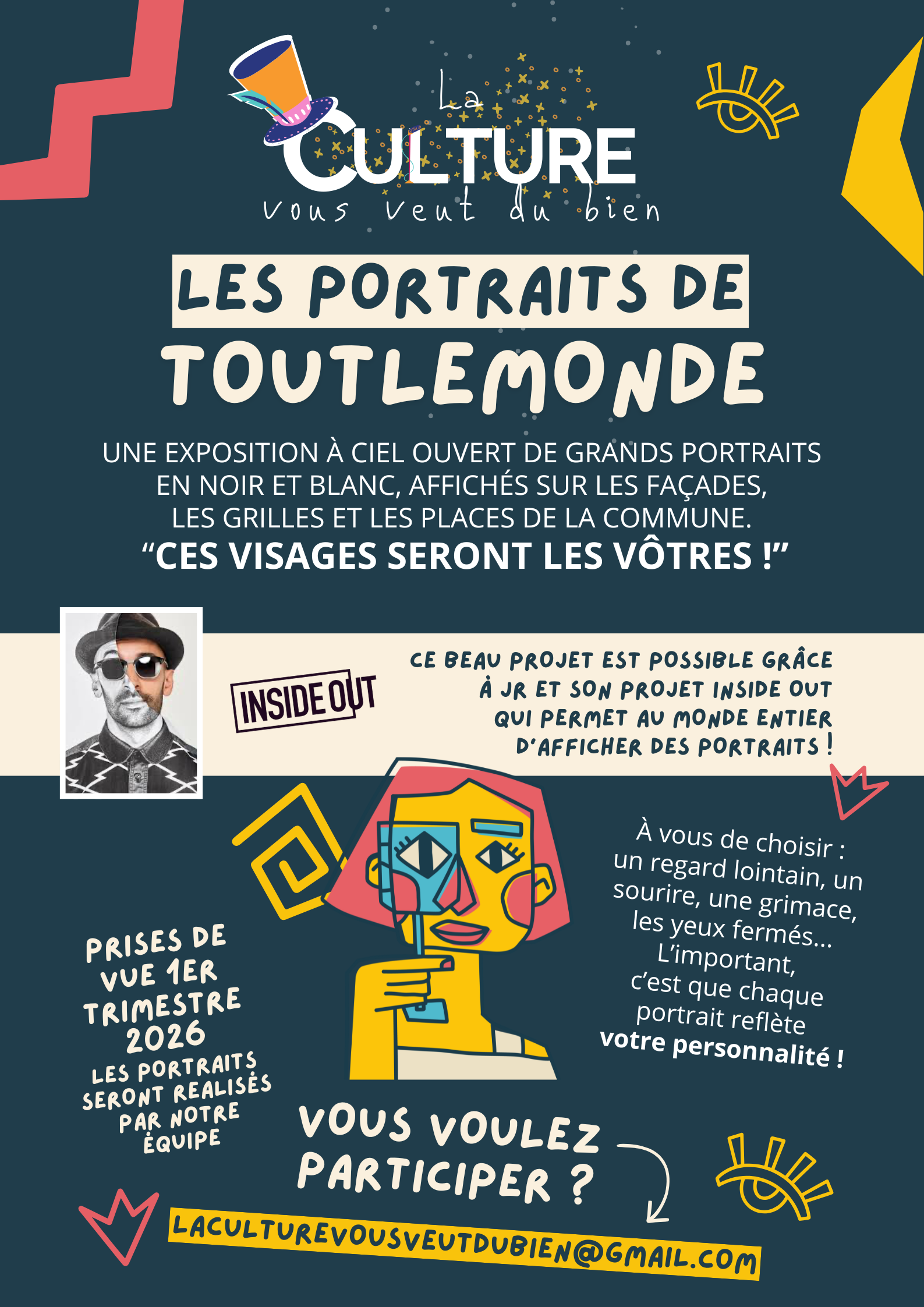 Le 11 janvier, lors du marché, nous débuterons les prises de vue. À vous de choisir : un regard lointain, un sourire, une grimace, les yeux fermés… L’important, c’est que chaque portrait reflète votre personnalité. Notre objectif ? Afficher au moins 50 visages de Toutlemonde, pour transformer notre bourg en galerie à ciel ouvert.